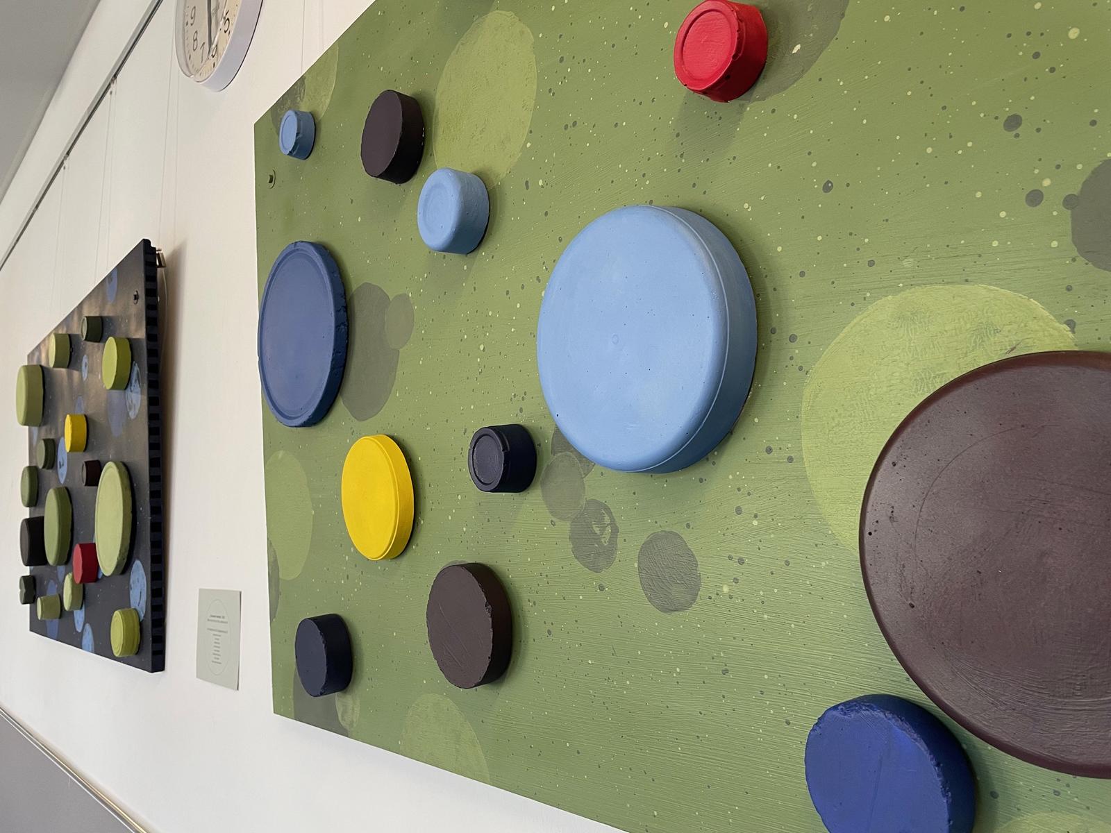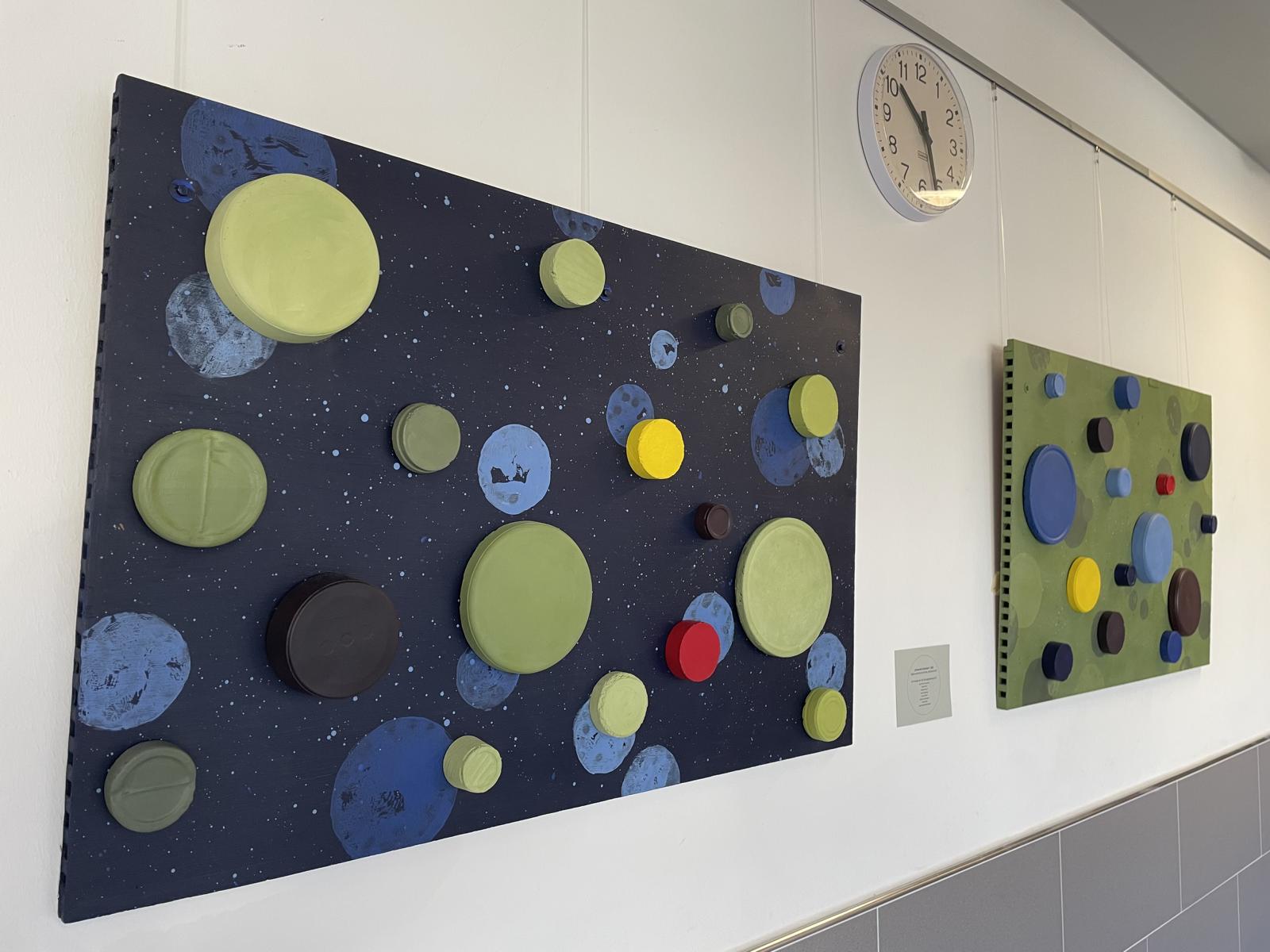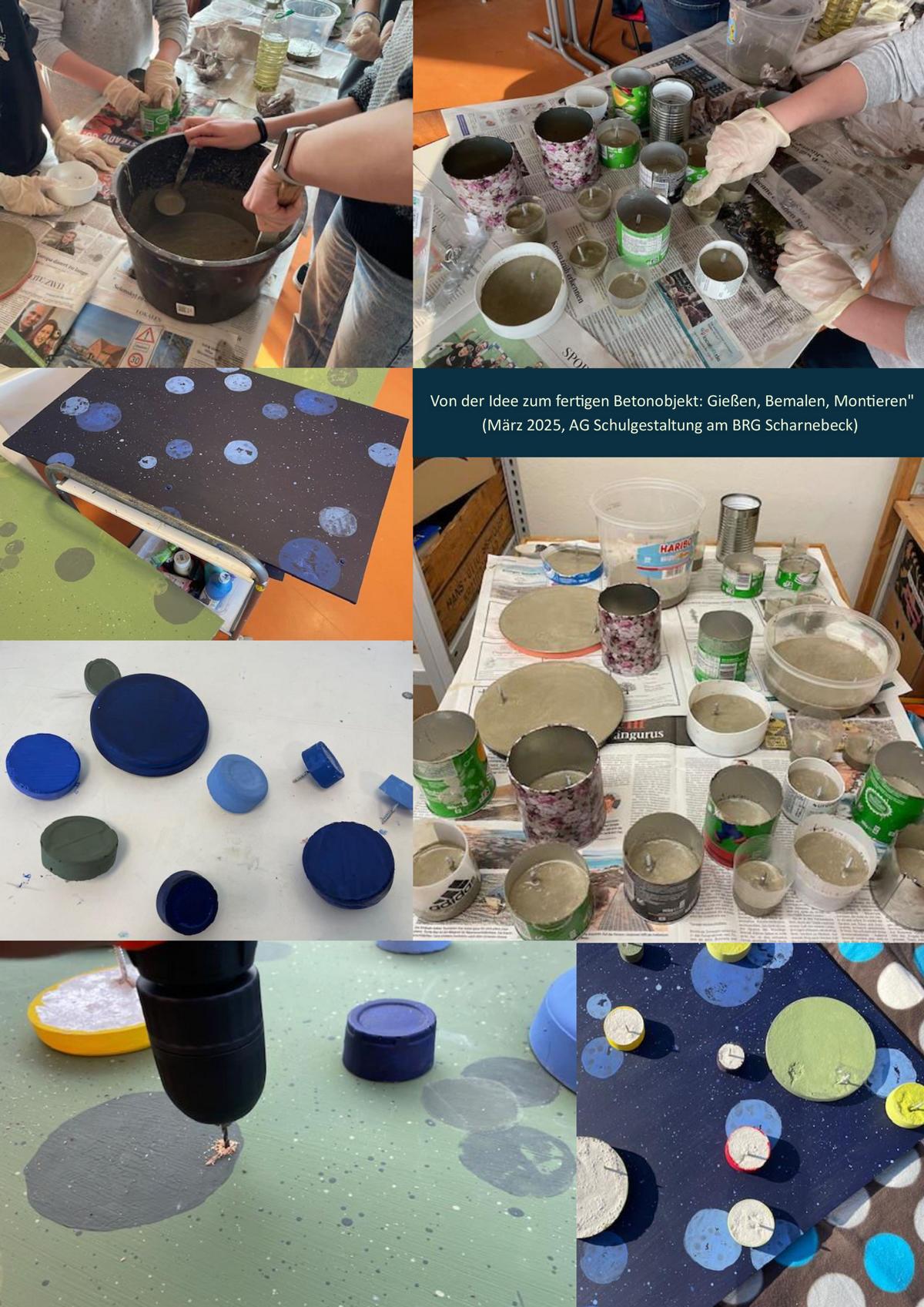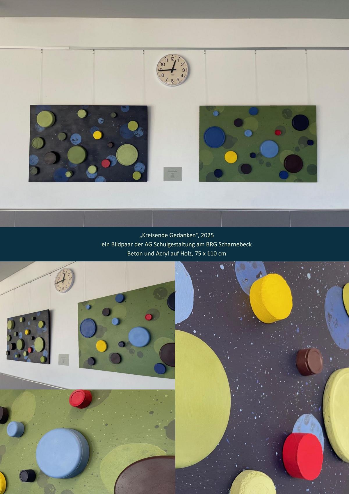 Zwei alte Holztüren aus dem Schulkeller wurden auf 75 x 110 cm zugeschnitten. Je vier Mitglieder gestalteten ein Bild, bemalten und bedruckten die Untergründe nach einem gemeinsam erstellten Farbkonzept. Haribo-, Keks-, Pringles- und Konservendosen dienten als Gussformen. Diese schnitten wir passend zu, ölten sie ein und füllten sie mit Beton. Ösenschrauben wurden in der Masse verankert. Nach dem Aushärten entfernten wir die Hüllen, schliffen und bemalten die Formen. Die Montage auf Holz erfolgte durch Bohren und Verschrauben – eine kreative Herausforderung. Das im April 2025 fertiggestellte Bildpaar wurde in einem gut besuchten Schulgang nahe einer Wanduhr platziert und erhielt den Titel „Kreisende Gedanken“.